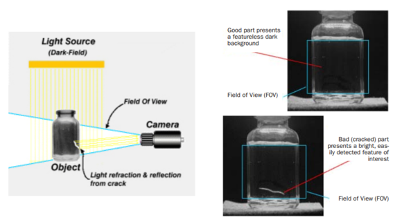 在该应用中,暗背景下,非散射性暗视场照明能够凸显被测物特征,使裂纹呈现亮色。